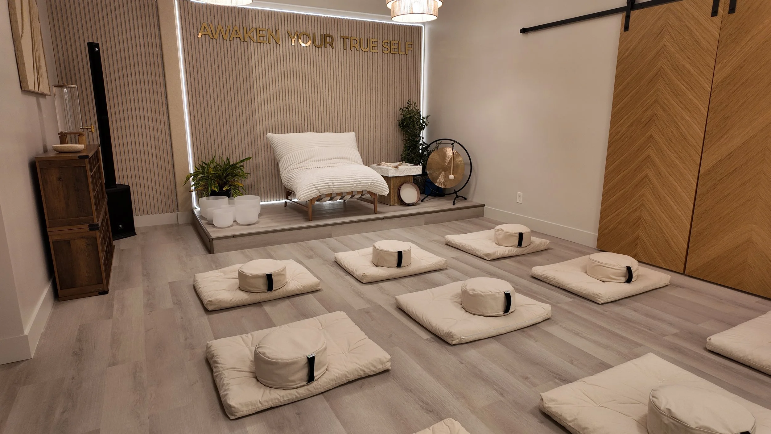 This intentionally designed meditation room is where ceremonial gatherings, healing circles, spiritual workshops, and soul-aligned social events come to life. Every corner of the space is infused with frequency-raising elements — from grounding textures and natural light to sacred geometry, crystals, and sound-enhancing architecture.